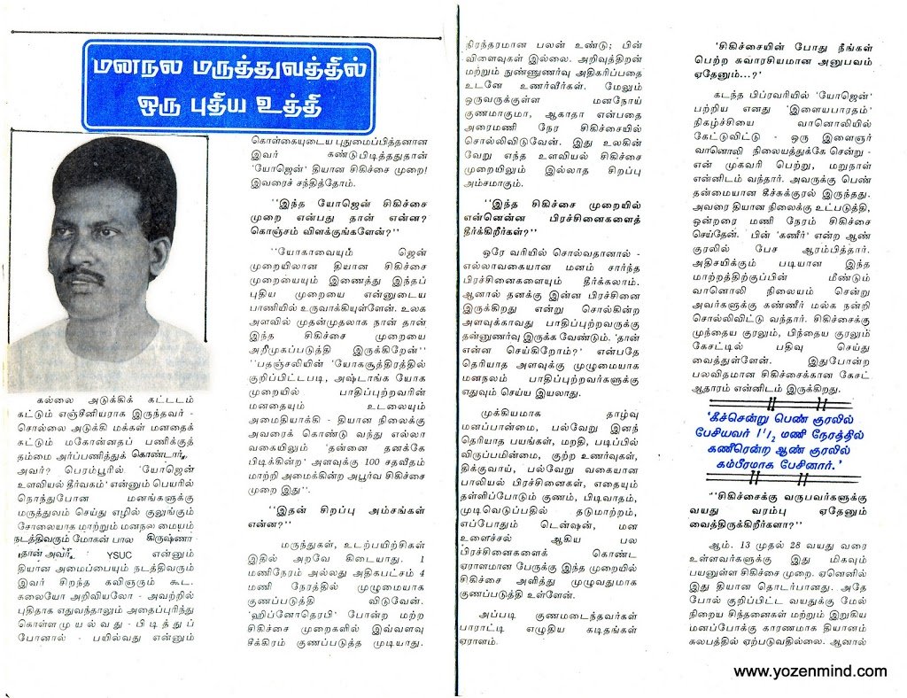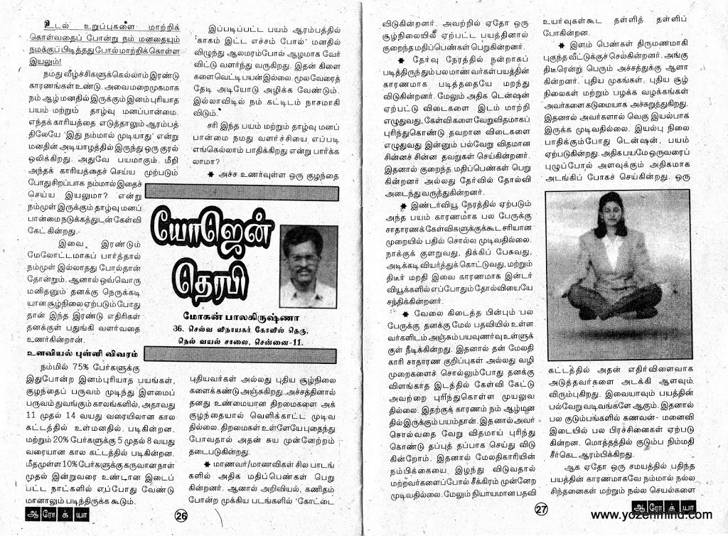 Yozen Mind Counselling Psychology Therapy & Self-Development Center in Chennai, T. Nagar Estd in 1992, focusing Students, Professionals & Homemakers, cures 1001 Psy-Challenges in few sessions. Yozen Therapy relieves your life-long Stress, Premarital/Marital issues, Fears, Phobias, wipes out Guilt feeling, Bad habits, Lack of Concentration in Studies/Job, Social Anxiety, Depression, Suicidal Mindset, Undue Anger, Obsessive disorders, Behaviour problems, illusion, Delusion, Unconscious Attitude and several hidden Mind Related tough Psy-Challenge.